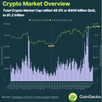 Theo CoinGecko, khối lượng giao dịch trung bình hàng ngày cũng tăng, tăng 30% theo quý từ -33% trong quý 4 năm 2022 lên tổng cộng 77 tỷ USD trong quý 1 năm 2023.