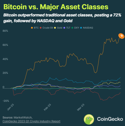 Điều ngạc nhiên trong báo cáo của CoinGecko, Bitcoin là tài sản có hiệu suất tốt nhất trong quý 1 năm 2023. Đồng coin này có mức tăng 72,4% theo quý, tiếp theo là chỉ số NASDAQ (15,7%) và vàng (8,4%).