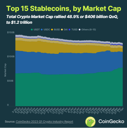 Stablecoin không có trải nghiệm tốt nhất trong Q1. Một số sự kiện đã diễn ra trong quý đã ảnh hưởng đến loại tài sản. Đầu tiên, Paxos ngừng phát hành BUSD. Ngoài ra, sự sụp đổ của Ngân hàng Silvergate đã ảnh hưởng đến Circle, công ty đứng sau USDC.