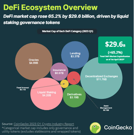 Thế giới DeFi đã đạt được một vài con số ấn tượng. Thị trường của ngành đã tăng 65,2% trong quý đầu tiên của năm 2023, tương đương 29,6 tỷ USD, chủ yếu là do hiệu suất của các token quản trị liquid staking.