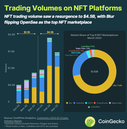 Trong giai đoạn 2023-Q1, khối lượng giao dịch NFT tăng đáng kể, tăng 68% từ 2,1 tỷ USD trong giai đoạn 2022-Q4 lên 4,5 tỷ USD. Cũng có một tân binh với những con số ấn tượng là Blur, một nền tảng NFT mới được giới thiệu vào tháng 10 năm 2022, chiếm phần lớn khối lượng giao dịch trong NFT.
