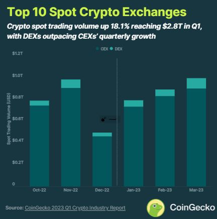 CoinGecko cũng đã báo cáo top10 sàn giao dịch tiền điện tử hàng đầu có khối lượng giao dịch spot đạt 2,8 nghìn tỷ USD trong quý 1 năm 2023. Con số này thể hiện mức tăng 18,1% so với quý 4 năm 2022.