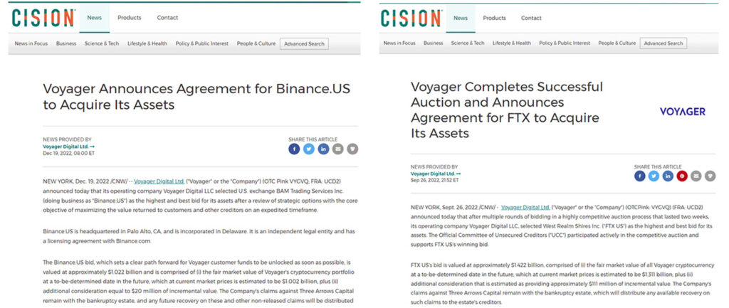 Sau đó, Cointelegraph vào tháng 10 đã đưa tin rằng sàn giao dịch tiền điện tử gặp khó khăn FTX.US đã đảm bảo đấu thầu tài sản của Voyager với giá 1,4 tỷ USD, trong đó 51 triệu USD là tiền mặt. Thỏa thuận trước đó cho phép thanh toán đầy đủ các yêu cầu cấp cao và cho phép các chủ nợ không có bảo đảm thu hồi khoảng 72% giá trị tài khoản của họ. Nhưng sau đó vài tuần, thỏa thuận cũng đã đi đến hồi kết do sự sụp đổ của FTX.