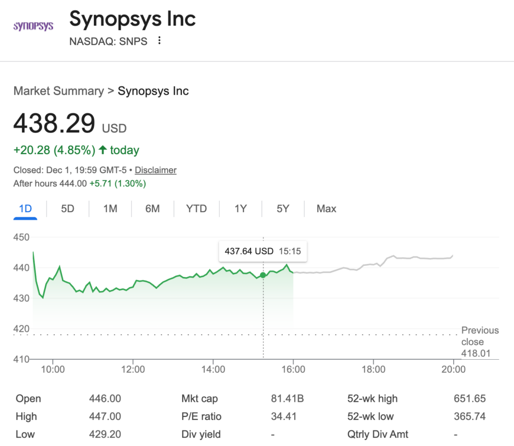 Hệ quả chưa dừng lại ở đó. Trước sức ép gia tăng, Synopsys đã công bố cắt giảm 10% lao động—động thái nhằm tinh gọn hoạt động sau thương vụ thâu tóm Ansys trị giá tới 35 tỷ đô la. Tổng thể, các sự kiện này đã khiến cổ phiếu Synopsys biến động mạnh, đưa biên độ giao dịch 52 tuần dao động từ 366 USD tới 652 USD/cổ phiếu.