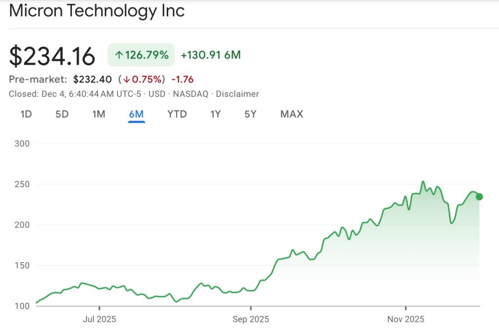 Để làm rõ hơn, Micron kết thúc ở mức 234,16 USD/cổ phiếu vào ngày 4/12/2025, đây là một mức tăng ấn tượng so với sáu tháng trước. Tại đỉnh điểm cuối tháng 9, MU đạt mức tăng hàng tháng cao nhất trong hơn mười năm. Tuy nhiên, đà tăng mạnh này cũng đặt trọng tâm vào khả năng của Micron trong việc duy trì hoặc vượt kỳ vọng của thị trường, đặc biệt khi thị trường bộ nhớ và lưu trữ vốn rất chu kỳ.