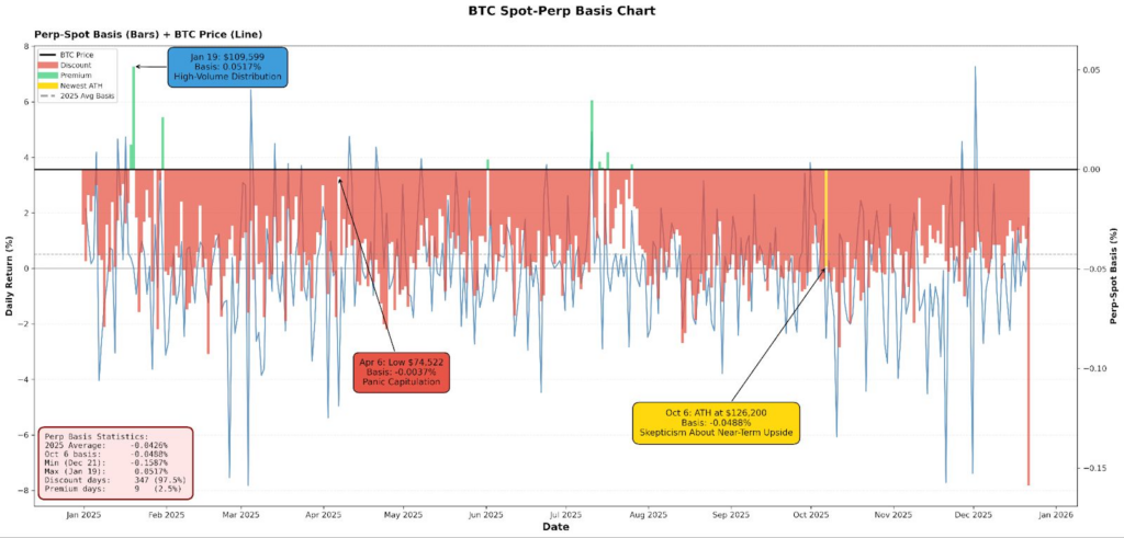 Hàm ý chính: Giao dịch khối lượng lớn tại đáy cho thấy sự chuyển thanh khoản: các weak hand rời bỏ cuộc chơi, strong hand tích lũy. Basis âm xác nhận trạng thái phòng thủ, yếu tố lành mạnh trong các pha bán tháo vì nó tạo nền cho một nhịp hồi bền vững.
