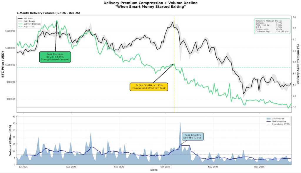 Basis spot-perp đã cho thấy không có sự thay đổi về niềm tin ngắn hạn, ngay cả tại đỉnh. Sự thiếu niềm tin tức thời này phản chiếu lên đường cong kỳ hạn, khi premium của kỳ hạn bắt đầu nén nhanh từ tháng 08, báo hiệu niềm tin forward đã suy yếu từ trước đỉnh tháng 10. Giữa mức trung bình tháng 09 là 1,95% và tháng 10 là 1,27%, premium kỳ hạn giảm 0,68 điểm chỉ trong một tháng, mạnh hơn so với mức giảm 0,44 điểm giai đoạn 07–08 (từ 3,25% xuống 2,81%). Độ dốc tiếp tục tăng tốc từ tháng 10 sang tháng 11 với cú sụt 0,82 điểm trong một tháng. Quan trọng là ngay trong ngày 06/10 (ngày lập ATH mới), premium kỳ hạn chỉ ở 1,93%, tức đã giảm gần 60% so với đỉnh 3,84% của tháng 07. Chuỗi diễn biến này cho thấy các giá trị trung bình theo tháng xác nhận niềm tin forward suy giảm nhanh hơn đáng kể so với nhịp hội tụ tự nhiên về đáo hạn, với tháng 10 đánh dấu giai đoạn nén tốc độ cao.