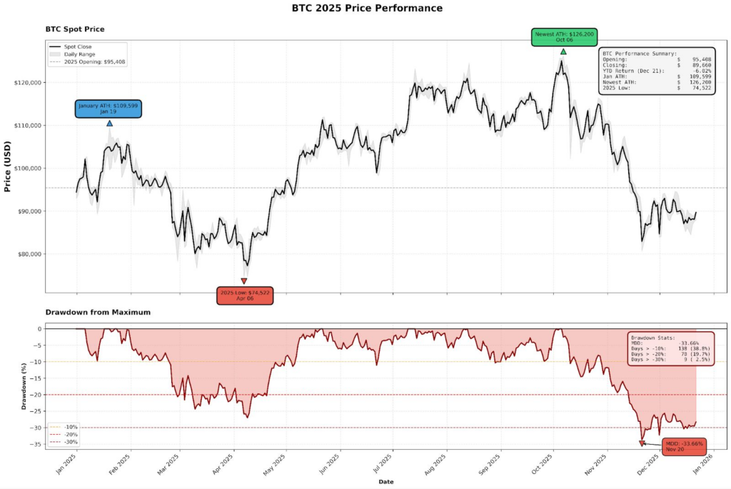 Bitcoin đưa giới trader qua một hành trình tàu lượn siêu tốc trong năm 2025. Năm mở màn bằng sự hưng phấn vì ETF, rồi lao dốc về vùng $74.000 vào làn sóng Bán tháo tháng 04. Đến tháng 10, một ATH mới thắp lại hứng khởi trong chốc lát, nhưng đà tăng nguội rất nhanh khi tháng 11 biến hưng phấn thành Bán tháo, buộc thị trường phải “reset” trước thềm năm mới.