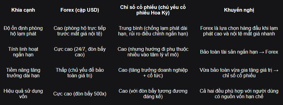 ● Nếu mục tiêu chính của bạn là bảo vệ tài sản nhanh và vững trước mất giá nội tệ và bào mòn bởi lạm phát, thì forex phù hợp hơn vì phản ứng nhanh và trực tiếp.