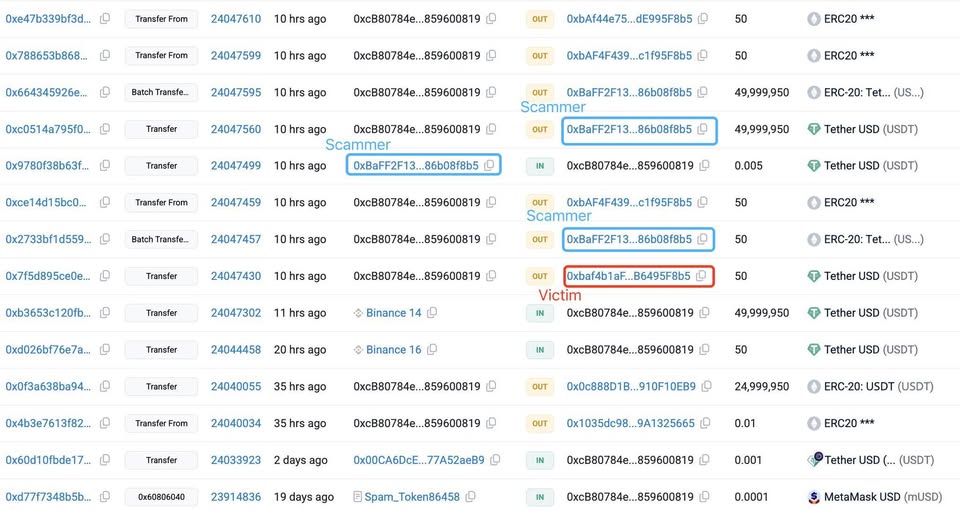 Theo các đơn vị theo dõi on-chain, nạn nhân đã chuyển thử 50 USDT để kiểm tra địa chỉ nhận. Ngay sau đó, kẻ gian tạo một ví giả mạo có cùng ký tự đầu và cuối, rồi gửi một giao dịch “dust” nhỏ nhằm làm nhiễm lịch sử giao dịch của nạn nhân.