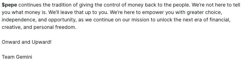 Coinbase đã gửi một email tới những khách hàng của mình, trong đó kèm một mô tả memecoin Pepe (PEPE) là một "biểu tượng thù địch" được các nhóm alt-right "đồng chọn". Động thái này đã thu hút sự phẫn nộ đáng kể từ cộng đồng memecoin.