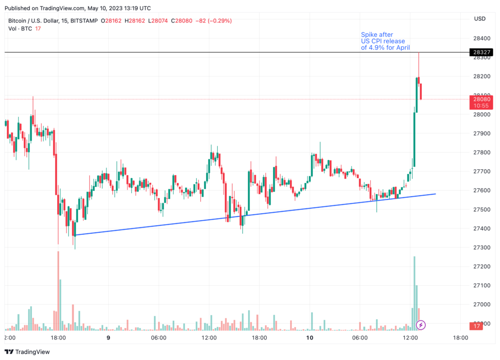 Biểu đồ giá cho thấy Bitcoin hiện đang trong xu hướng tăng và tài sản này đã đạt mức cao nhất là 28.327 USD để phản ứng lại thông báo về CPI của Hoa Kỳ vào tháng 4 năm 2023. Trước đó, giá BTC đã trải qua một đợt giảm giá, tuy nhiên, nó đã duy trì trên mức 28.000 USD.