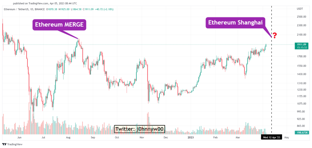 Dự đoán xu hướng giá Ethereum trong hai sự kiện The Merge và Shanghai. Nguồn: Twitter (@j0hnnyw00)