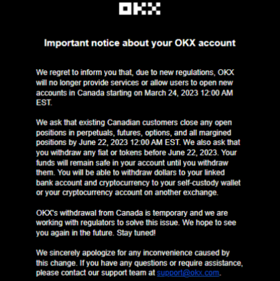 Vào ngày 20 tháng 3, sàn giao dịch tiền điện tử OKX đã thông báo cho người dùng Canada qua email rằng công ty “sẽ không còn cung cấp dịch vụ hoặc cho phép người dùng mở tài khoản mới ở Canada bắt đầu từ ngày 24 tháng 3 năm 2023, 12:00 AM EST”, trích dẫn “các quy định mới”.