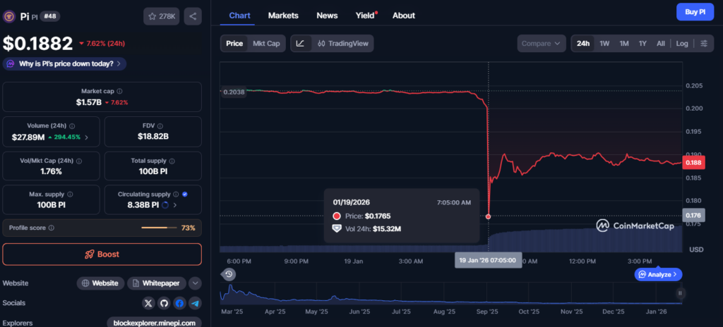 Trước đó, PI đã bỏ lỡ đợt tăng mạnh đầu tháng 1, khi Bitcoin tăng từ dưới 88.000 USD lên 98.000 USD, còn nhiều altcoin khác ghi nhận mức tăng hai chữ số. Ở thời điểm hiện tại, PI giảm hơn 7% trong ngày, giao dịch dưới 0,19 USD.
