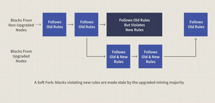 Các soft fork không yêu cầu bất kỳ node nào phải nâng cấp để duy trì sự đồng thuận, vì tất cả các khối có quy tắc soft fork mới cũng tuân theo các quy tắc cũ, do đó các khách hàng cũ chấp nhận chúng. Các đợt soft fork không thể bị đảo ngược nếu không có hard fork vì theo định nghĩa, một đợt soft fork chỉ cho phép tập hợp các khối hợp lệ trở thành một tập hợp con thích hợp của các đợt pre-fork hợp lệ.