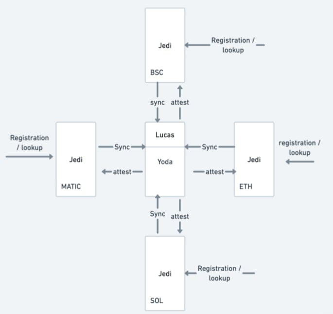 Yoda là một mạng Oracle đảm bảo tính duy nhất của các tên được đăng ký trên nhiều chuỗi. Nó sẽ thu thập các sự kiện đăng ký từ các chuỗi khác nhau, hợp nhất thông tin và cấp chữ ký xác thực cho người dùng muốn đăng ký hoặc cầu nối tên trên bất kỳ Jedi nào.
