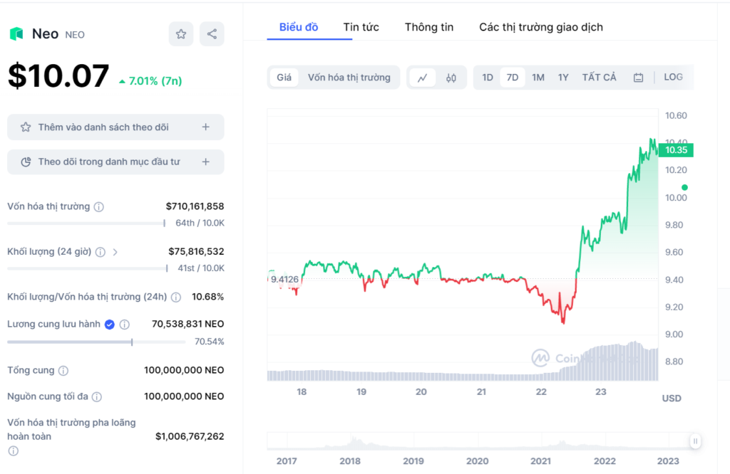 Một trong những token Trung Quốc đang dậy sóng, đặc biệt sau đợt bơm tiền của Trung Quốc, là NEO, còn được gọi là "Ethereum của Trung Quốc". Token được ra mắt vào năm 2014 với tên Antshares, sớm hơn Ethereum một năm. Hiện NEO có thể thực hiện khoảng 10.000 TPS và trị giá 1,2 tỷ USD FDV, tuy nhiên, nó chỉ có khoảng 70 triệu đô la TVL trong hệ sinh thái DeFi của nó, do Flamingo. Tổng nguồn cung token NEO được giới hạn ở mức 100 triệu sẽ được phát hành dần dần trong khoảng thời gian 15 năm.