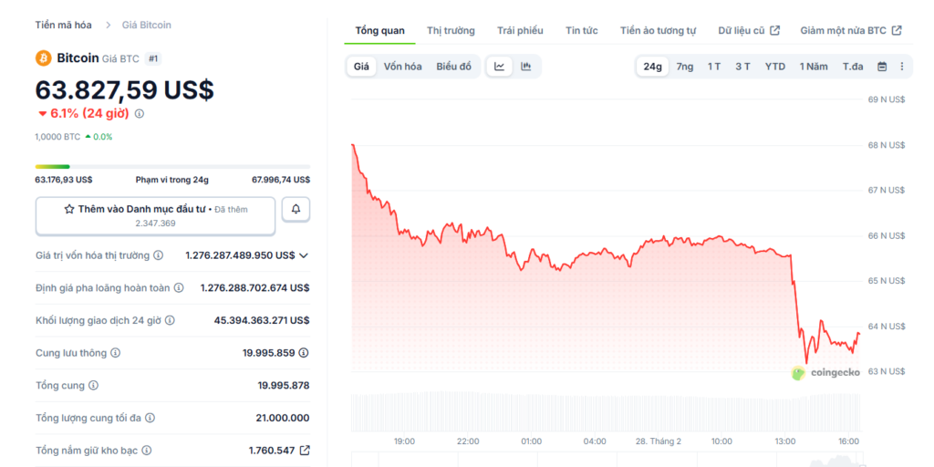Vốn hóa thị trường của Bitcoin hiện còn khoảng 1,27 nghìn tỷ USD, trong khi mức thống trị giảm xuống dưới 56% theo dữ liệu từ CoinGecko.