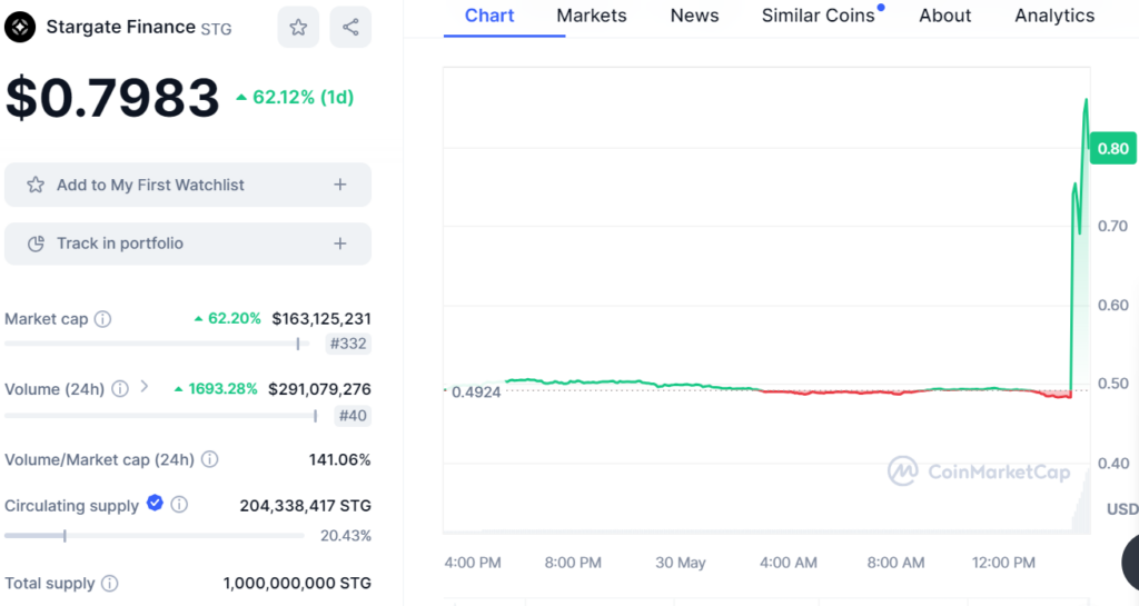Upbit, sàn giao dịch tiền điện tử lớn nhất Hàn Quốc, đã thông báo niêm yết Stargate Finance (STG), một sự án cầu nối blockchain, vào ngày 30 tháng 5 năm 2024. Việc niêm yết đã dẫn đến sự gia tăng đáng kể cho STG, với mức tăng hơn 60% sau thông báo cho thấy sự quan tâm đáng kể của thị trường đối với dự án.